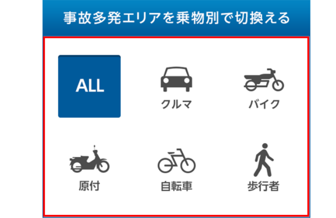 - 「乗物別」では、事故の多いエリアを乗物別にみることができます。選択した乗物の事故が含まれる場合、事故多発エリアの外側にマルが表示されます。
