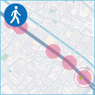 - 「ルート検索」では、検索したルート周辺の急ブレーキ多発地点や、事故多発エリアが表示されます。外出時などに、あらかじめ危険がひそんでいる地点を確認できますので、ご活用ください。