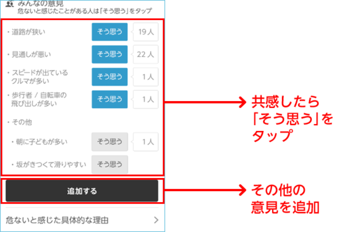 あなたの周囲で危ないと感じたことのある場所があったら、地図上で危ないと思う地点をクリックし、どのように危ないか情報を投稿してください。「急ブレーキ多発地点」や、「みんなの追加地点」にも、あなたの意見を投稿することができます。 投稿した情報はセーフティマップを見る歩行者・ドライバー・ライダーなどすべての交通参加者に共有されます。