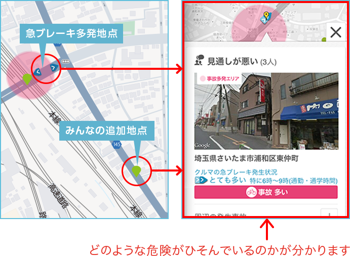 「急ブレーキ多発地点」と「みんなの追加地点」をクリックすると、その地点の詳細が表示されます。